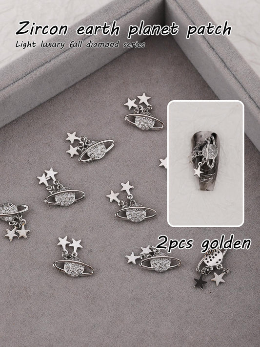 2pcs Light luxury Cubic Zirconia planet nail accessories Internet celebrity nail decoration